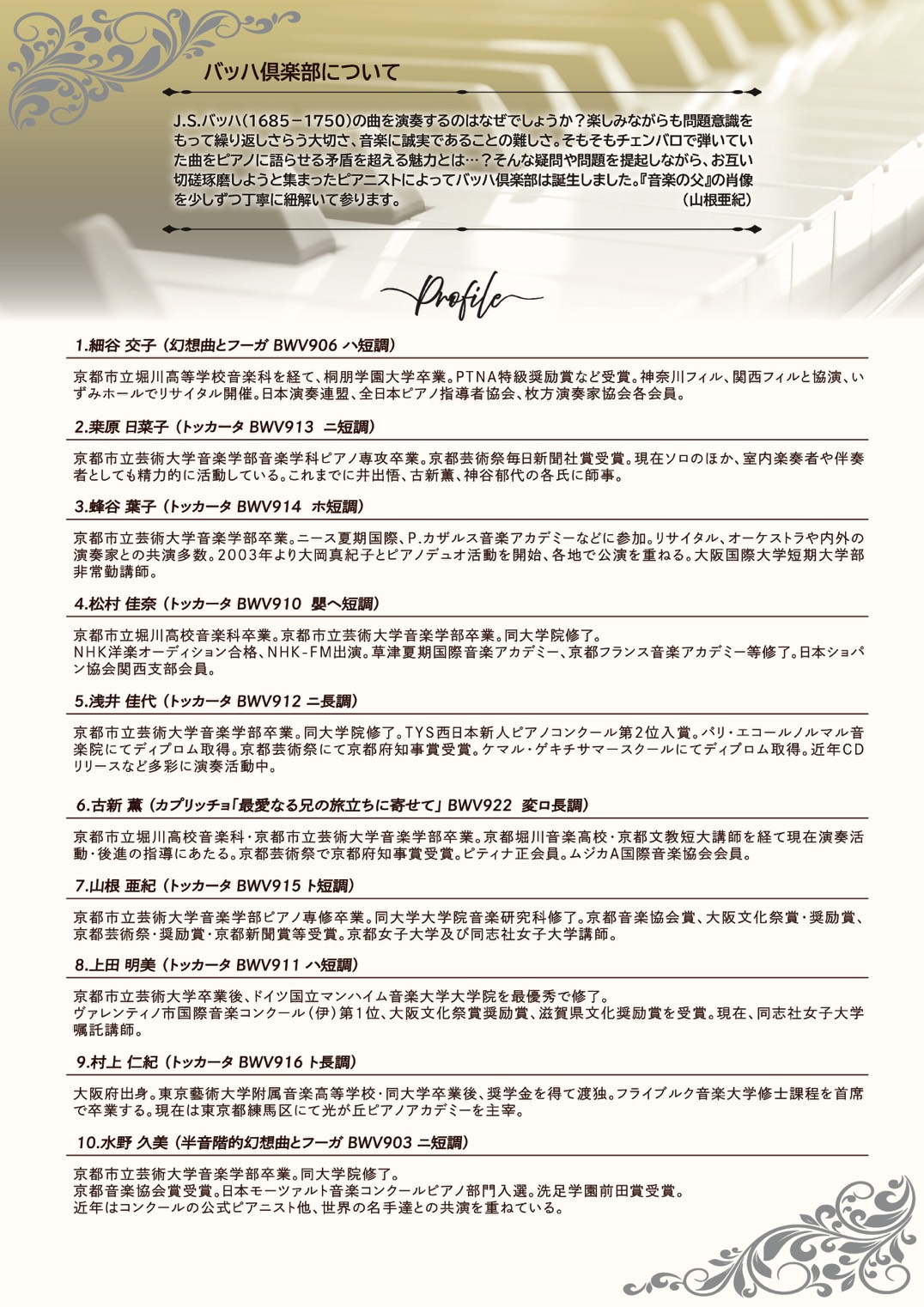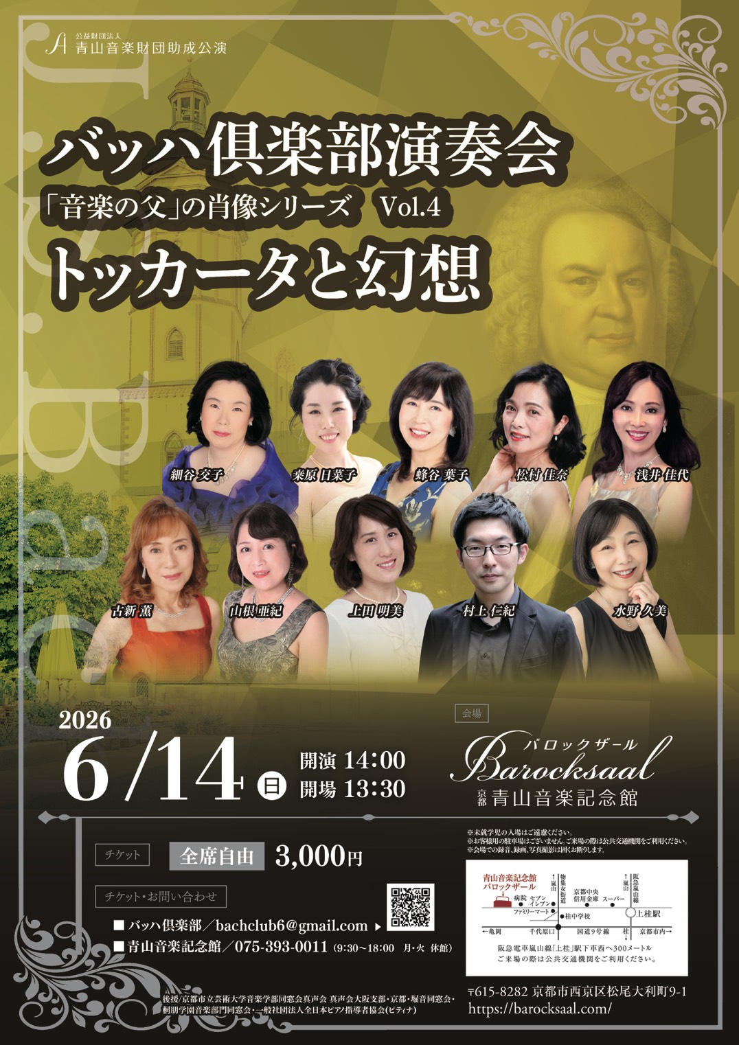 2026年6月14日 日曜日 バッハ倶楽部演奏会「音楽の父」の肖像シリーズVol.4 トッカータと幻想 開演日時 2026年6月14日(日)14時 会場 バロックザール 京都青山音楽記念館 出演 古新薫(25期Pf)、水野久美(29期Pf)、蜂谷葉子(29期Pf)、 松村佳奈(31期Pf)、山根亜紀(32期Pf)、浅井佳代(37期Pf)、 上田明美(44期Pf)、標尭菜子(55期Pf) 曲目 J.S.バッハ トッカータ全7曲BWV910〜916 幻想曲とフーガBWV906 カプリッチョ「最愛の兄の旅立ちに寄せて」BWV922 半音階的幻想曲とフーガBWV903 料金 3,000円 お問い合わせ bachclub6@gmail.com